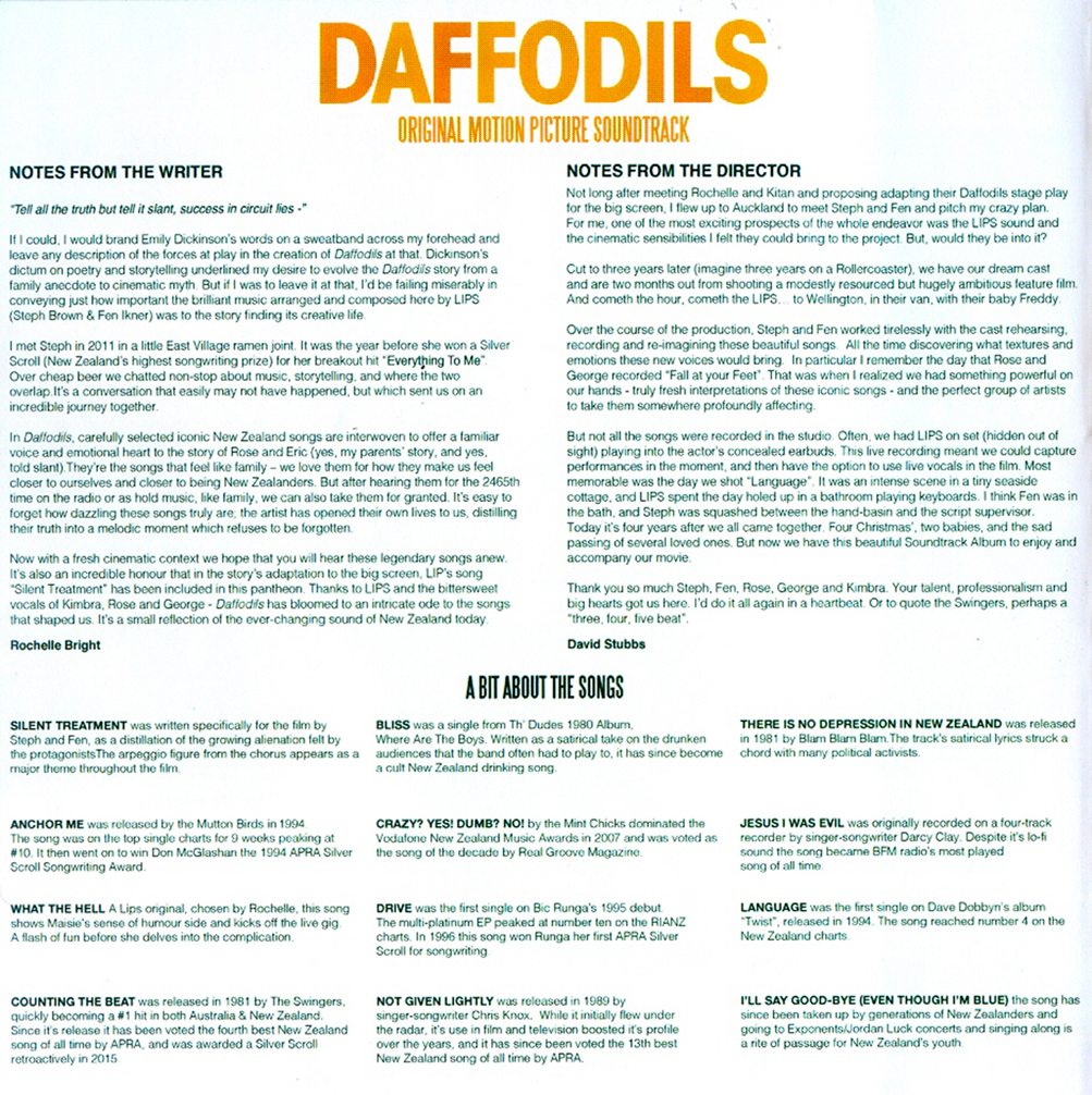 Daffodils - 2019Warner Music NZ - Digital - 38 minutesUPC # 5054197042676 Song Selections by Rochelle Bright; Music Coordinator: Otis Milo Rachtman Palmer; Additional Recording: Chris Winter at Mr Winter Audio, Tom Healey at Roundhead Studios, Troy Kelly at The Armoury, Mickey Petralia at The Pie Studios; Mastered by: Alex DeTurk at The Bunker Studio; Music Editor: Stephen Gallagher; Additional Music Coordination: Grace Verweji; Album Art by: Erueti Brown at Kia Ora-For-That!; Executive Soundtrack Producters: Karyn Rachtman and Kimbra. 'LIPS' are the artists Stephanie Brown and Ken Ikner. |